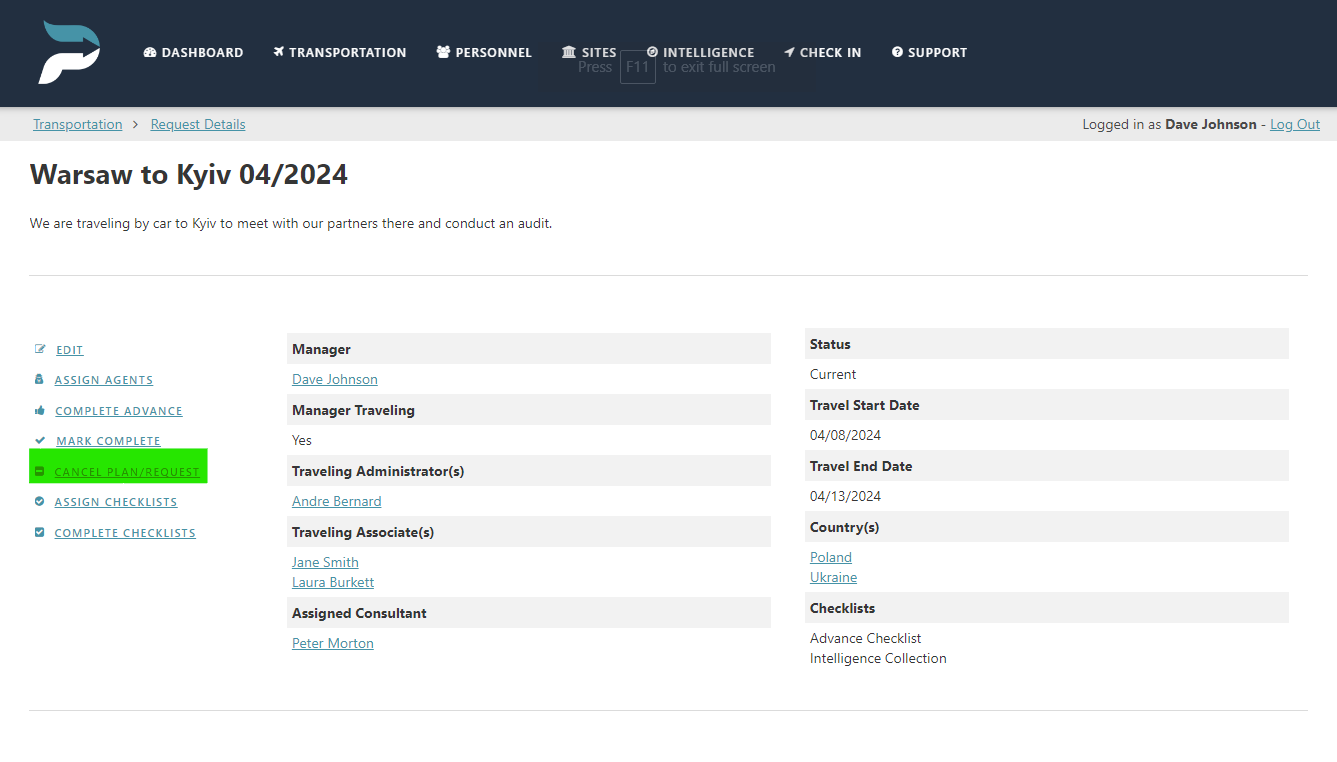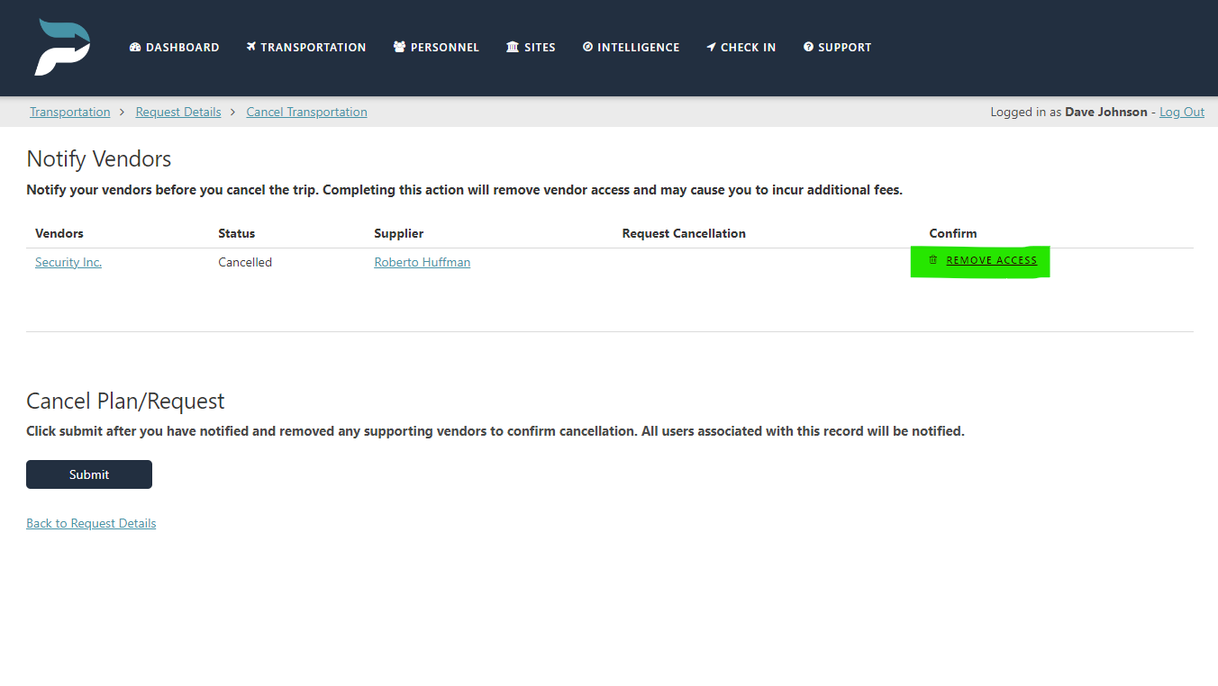 An email notification will be sent to all associated personnel and vendors that the plan/request has been canceled. The plan/request will move to the canceled tab and be archived within 24 hours for future reference.