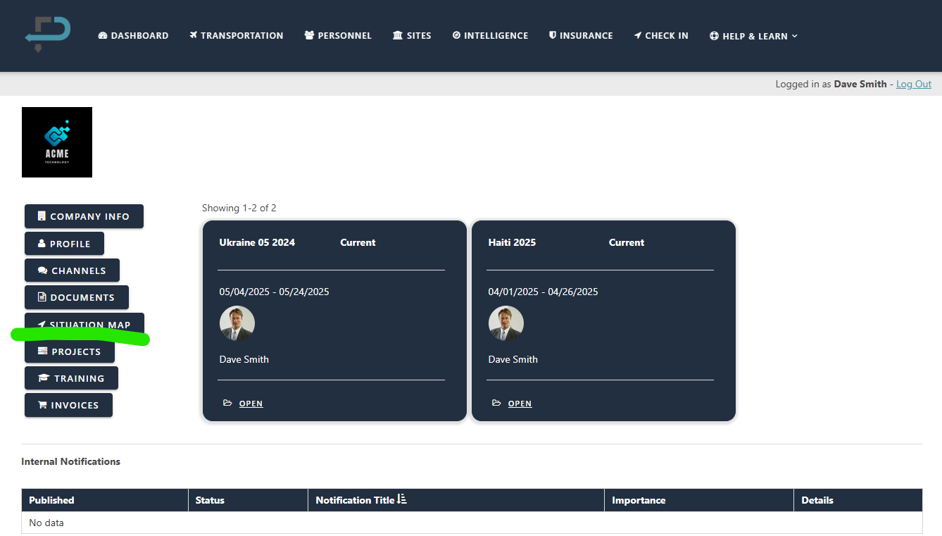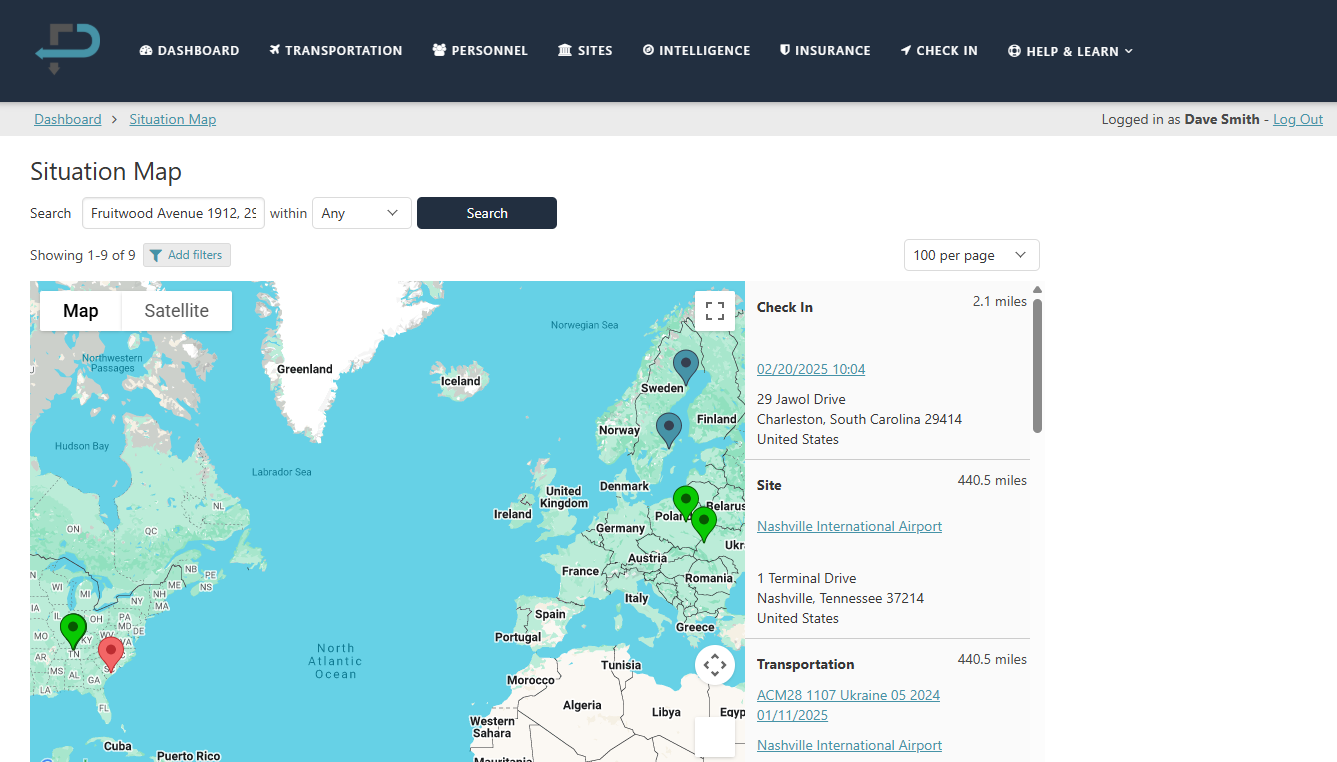 The situation map is only accessible to administrators and provides a simple view of your company’s information on a map. The map collects intelligence events, your sites, transportation requests and plans, and company user check-ins.